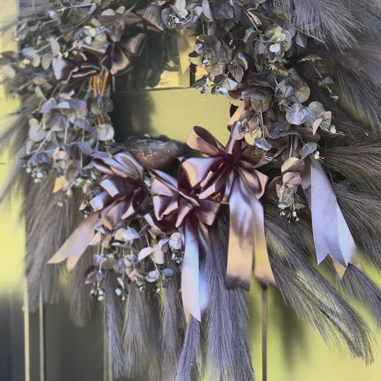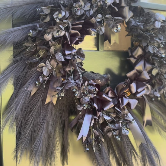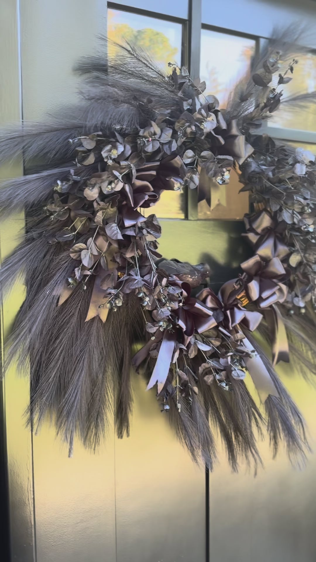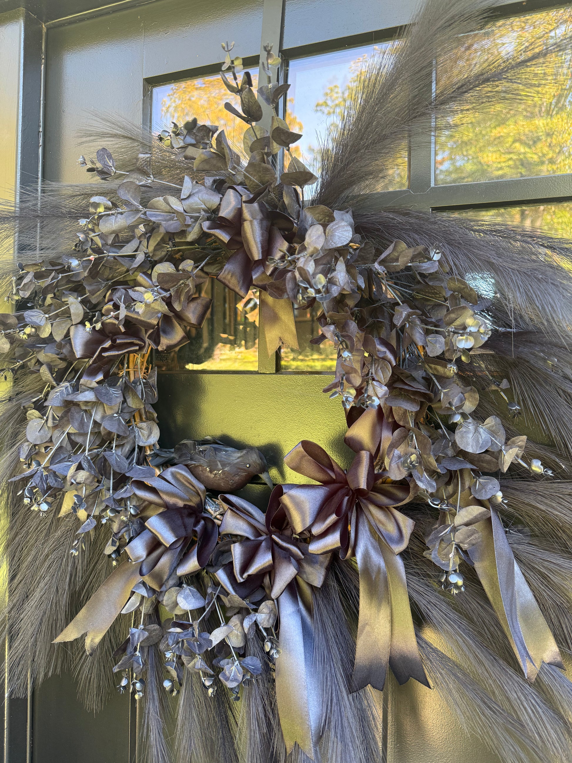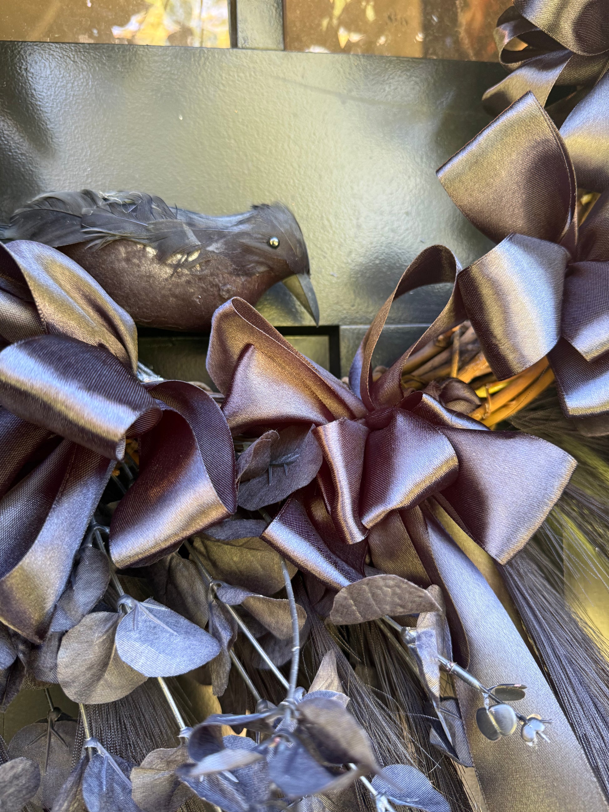 This black gothic Halloween wreath is a bold mix of satin ribbons, lush eucalyptus, and a perched crow—spooky yet elegant.