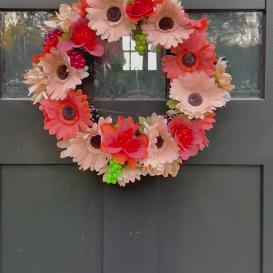 This 18-inch masterpiece features a delightful mix of handcrafted burlap daisies in soft beige, coral, and peach tones, accented with bold black centers for a striking look.