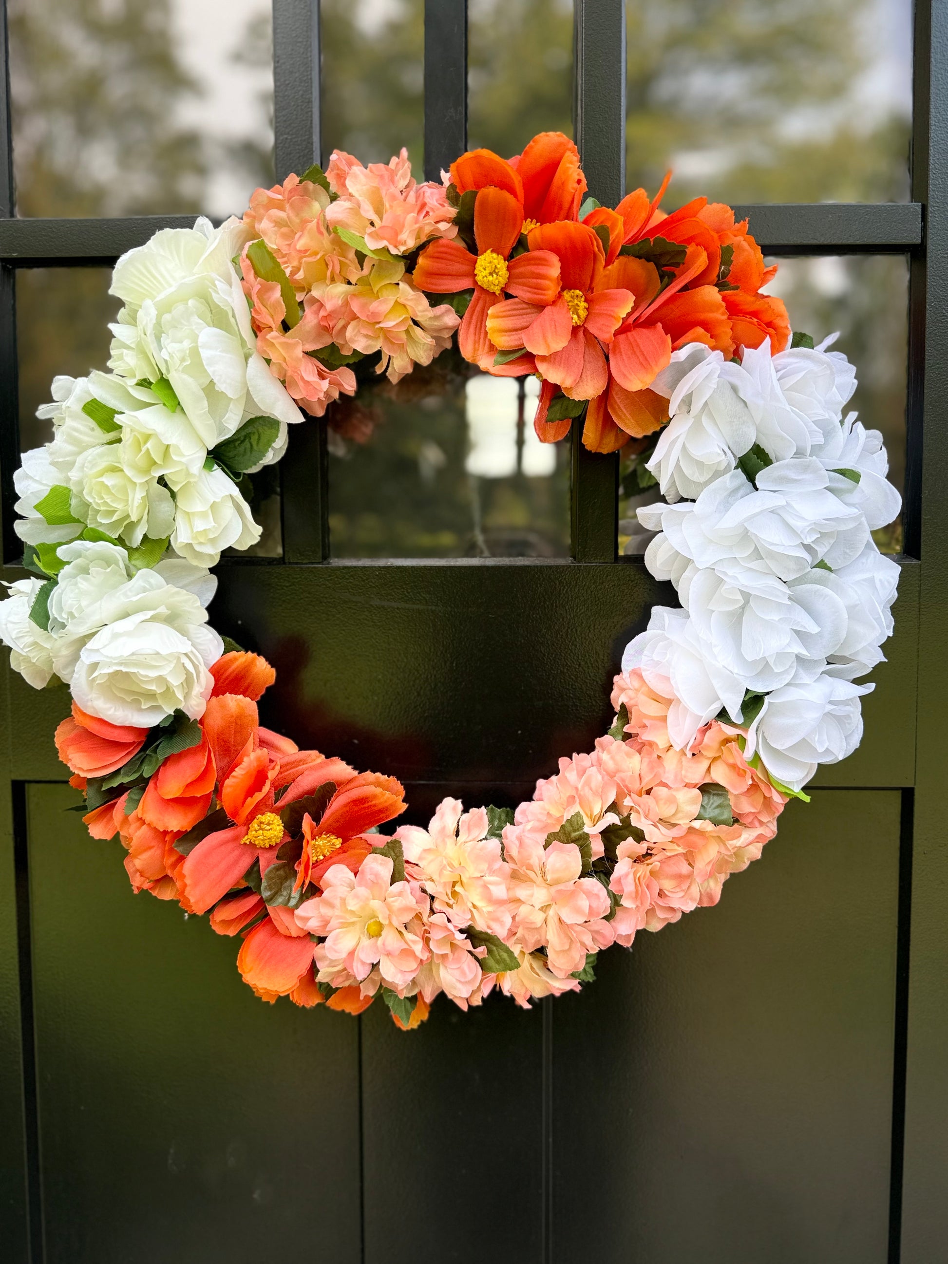 Welcome guests to your home with this vibrant handmade floral wreath, featuring a stunning mix of white roses, orange blossoms, and peach hydrangeas.