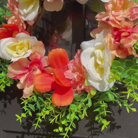 Featuring a lush base of faux eucalyptus greenery for a natural look, this wreath bursts with artificial silk flowers in gentle pastel shades: creamy white roses, peachy hydrangeas, soft yellow blooms, and vibrant orange poppies.